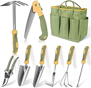 Garden Tool Set, WisaKey 9 Piece Stainless Steel Heavy Duty Green Gardening Tools with Non-Slip Ergonomic Handle, Durable Garden Tool Bag, Ideal Gardening Hand Tools, Gardening Gifts for Women and Men